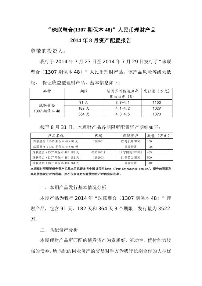 “珠联璧合(1307期保本48)”人民币理财产品2014年8月资产配置报告.doc