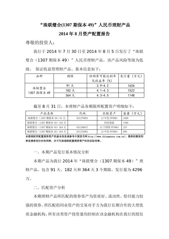 “珠联璧合(1307期保本49)”人民币理财产品2014年8月资产配置报告.doc