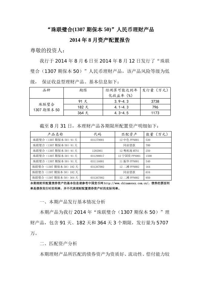 “珠联璧合(1307期保本50)”人民币理财产品2014年8月资产配置报告.doc