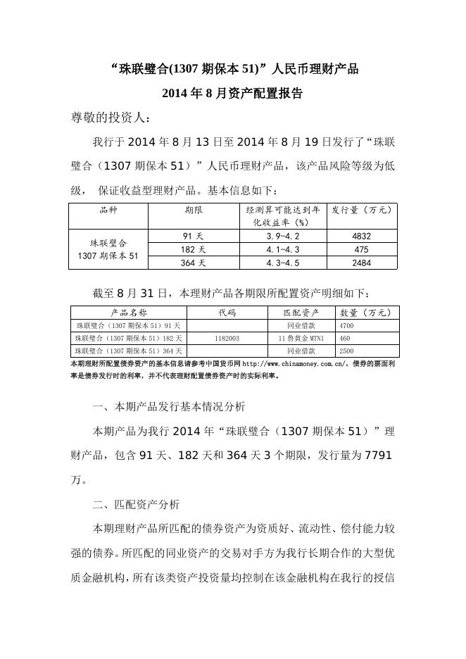 “珠联璧合(1307期保本51)”人民币理财产品2014年8月资产配置报告.doc