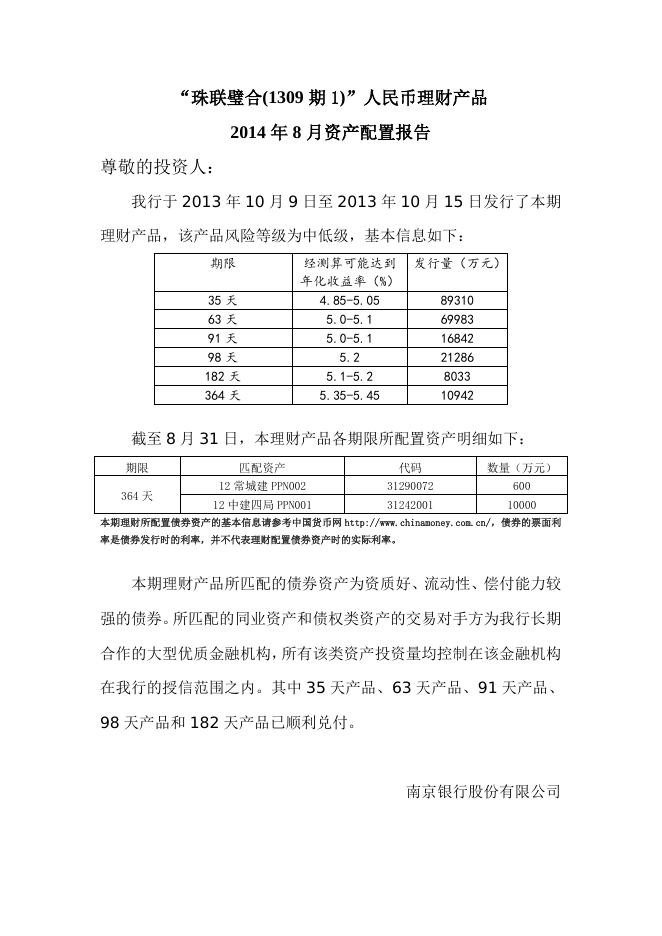 “珠联璧合(1309期1)”人民币理财产品2014年8月资产配置报告.doc