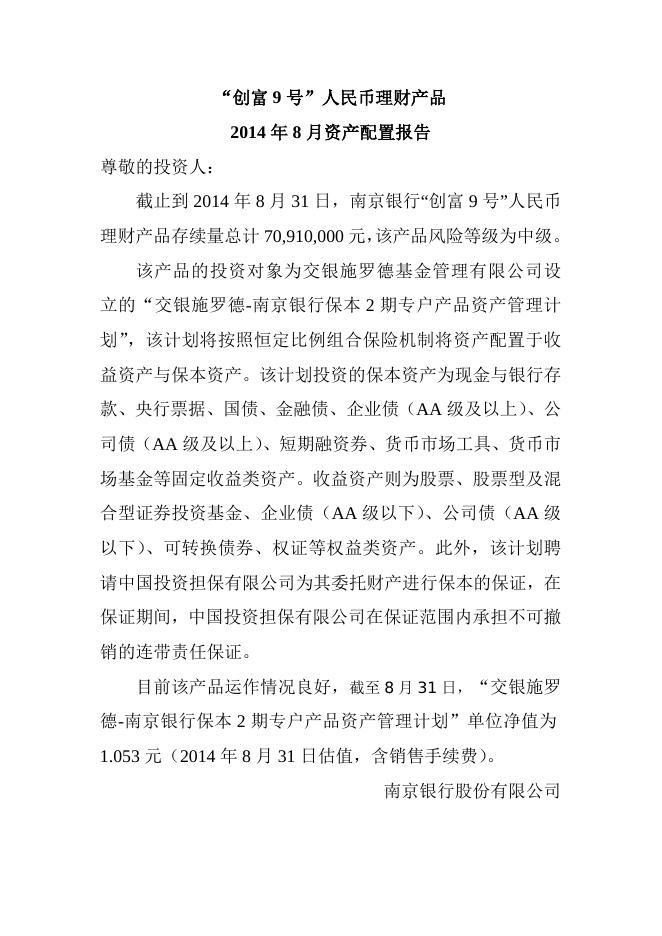 “创富9号”人民币理财产品2014年8月资产配置报告.doc