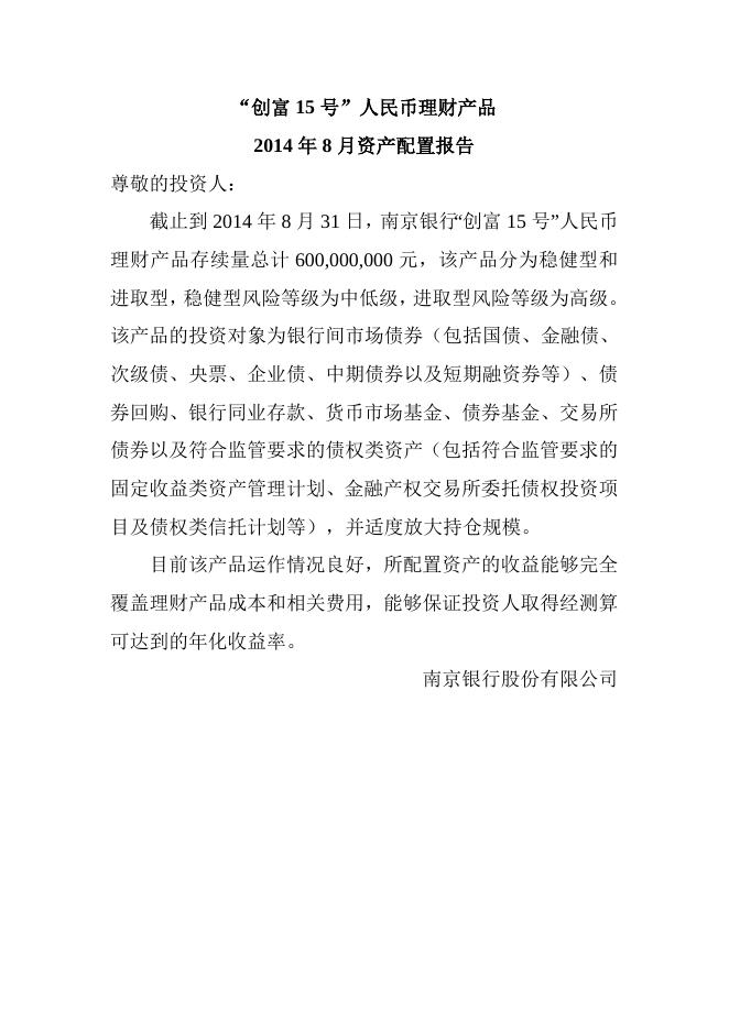 “创富15号”人民币理财产品2014年8月资产配置报告.doc