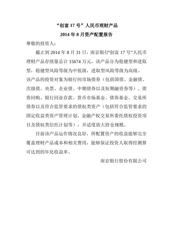 “创富17号”人民币理财产品2014年8月资产配置报告.doc