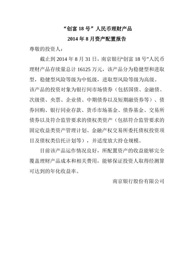 “创富18号”人民币理财产品2014年8月资产配置报告.doc