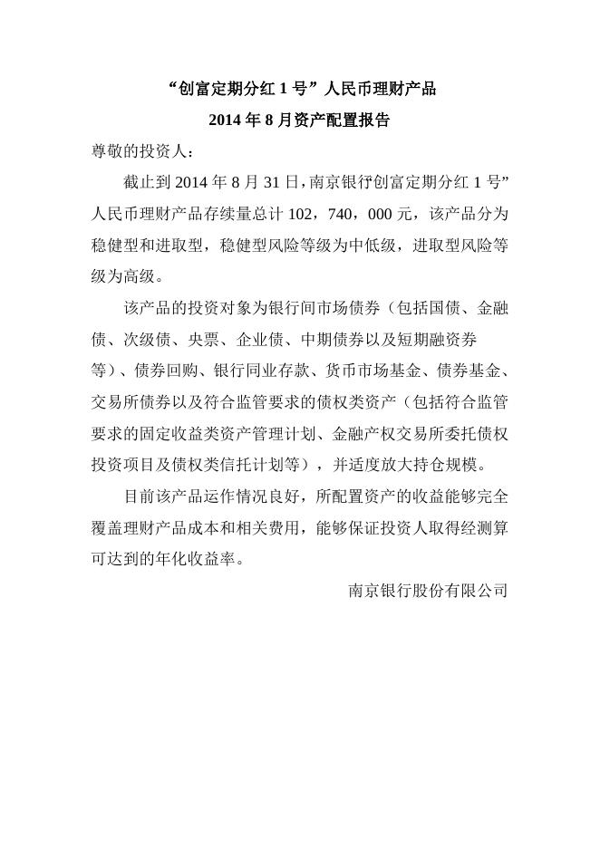“创富定期分红1号”人民币理财产品2014年8月资产配置报告.doc