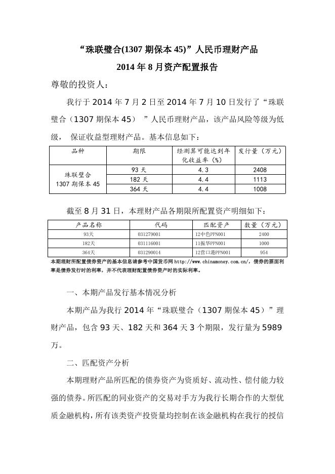 “珠联璧合(1307期保本45)”人民币理财产品2014年8月资产配置报告.doc