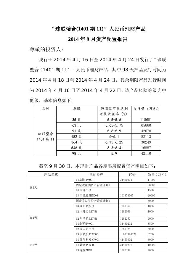 “珠联璧合(1401期11)”人民币理财产品2014年9月资产配置报告.doc