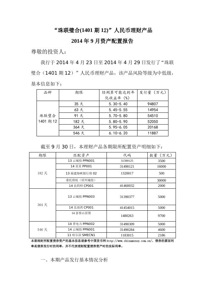 “珠联璧合(1401期12)”人民币理财产品2014年9月资产配置报告.doc