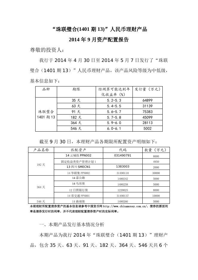 “珠联璧合(1401期13)”人民币理财产品2014年9月资产配置报告.doc