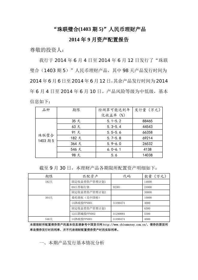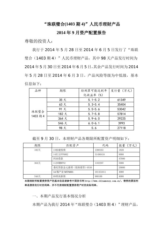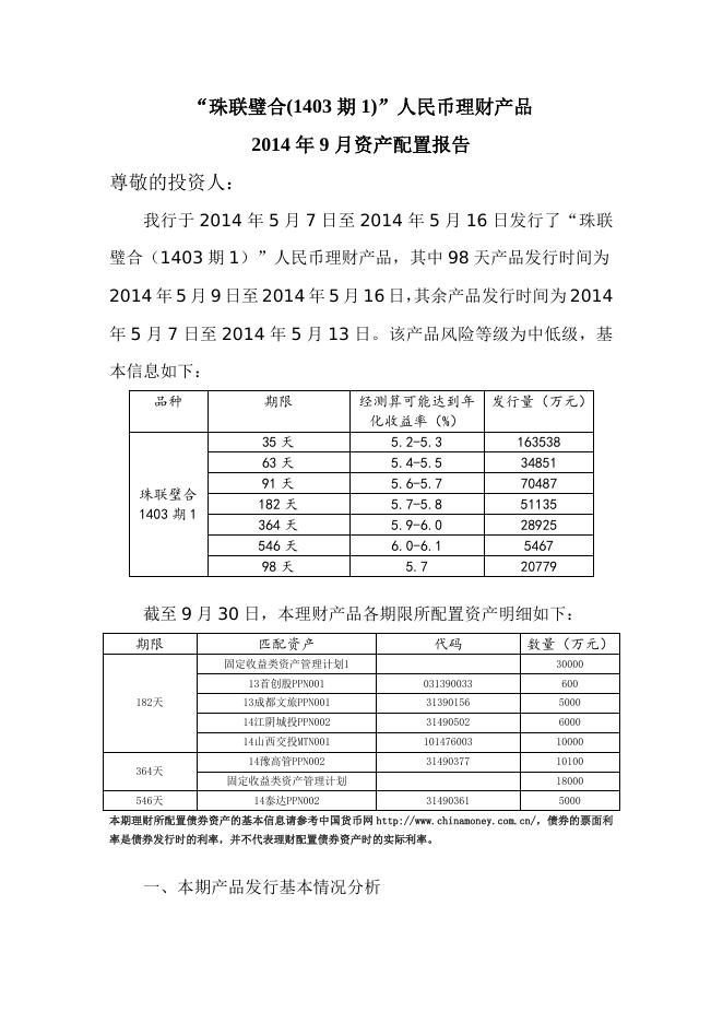 “珠联璧合(1403期1)”人民币理财产品2014年9月资产配置报告.doc