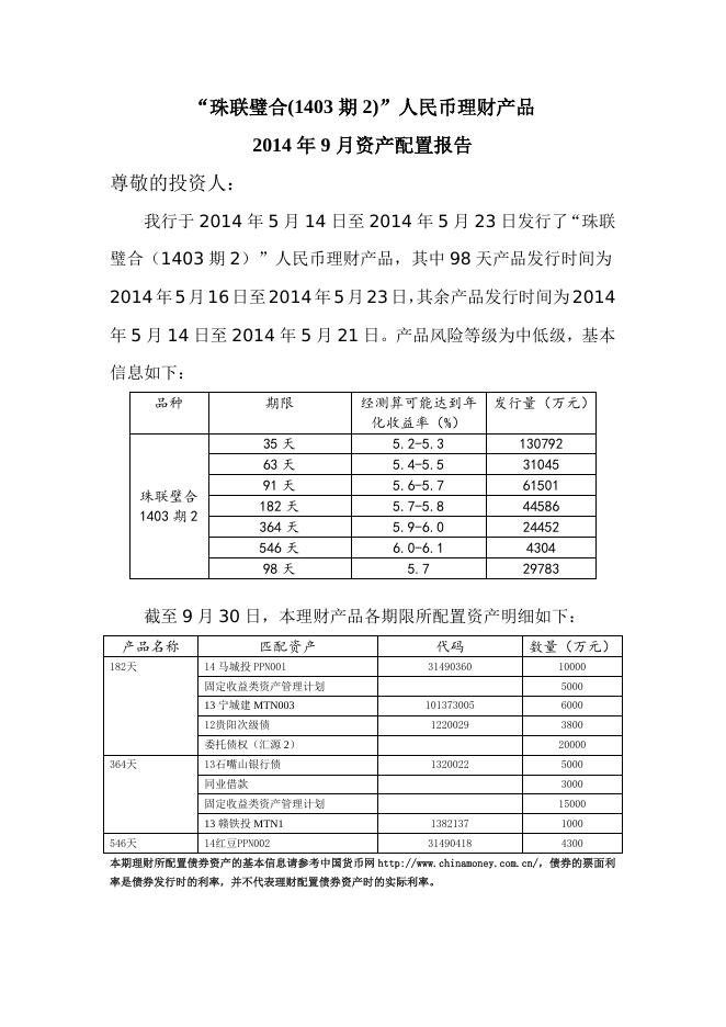 “珠联璧合(1403期2)”人民币理财产品2014年9月资产配置报告.doc