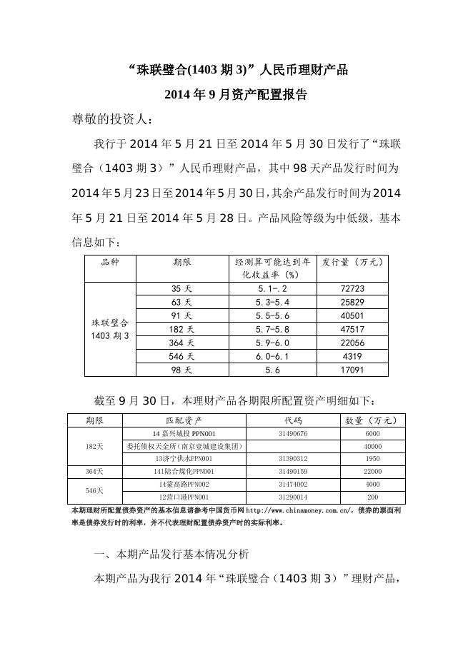 “珠联璧合(1403期3)”人民币理财产品2014年9月资产配置报告.doc