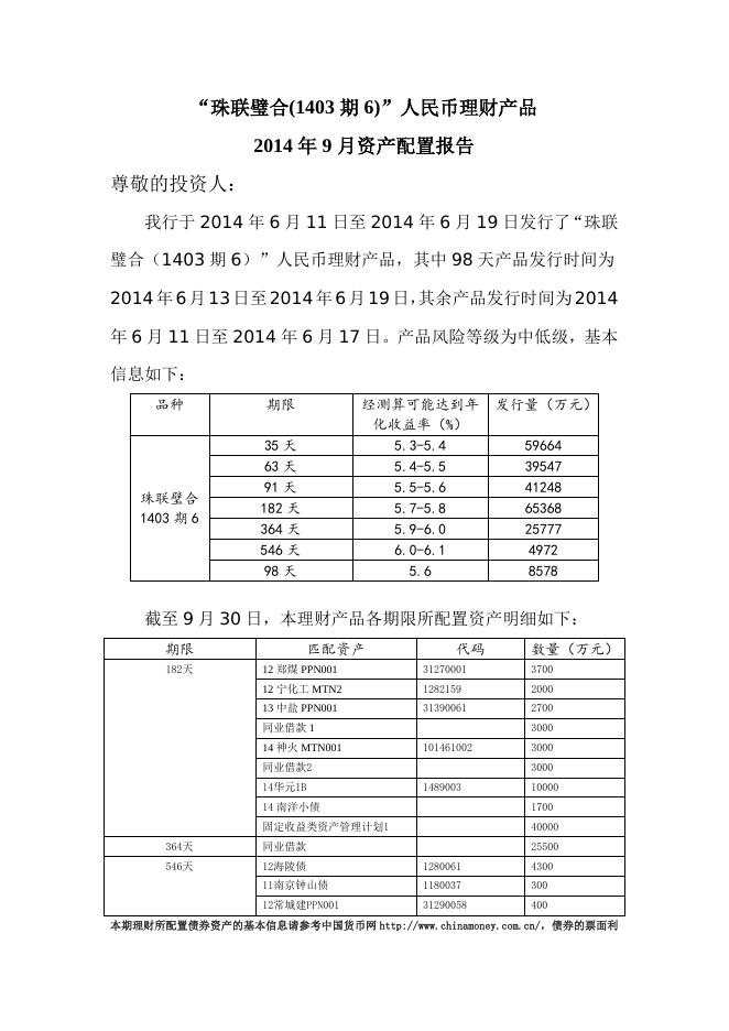“珠联璧合(1403期6)”人民币理财产品2014年9月资产配置报告.doc