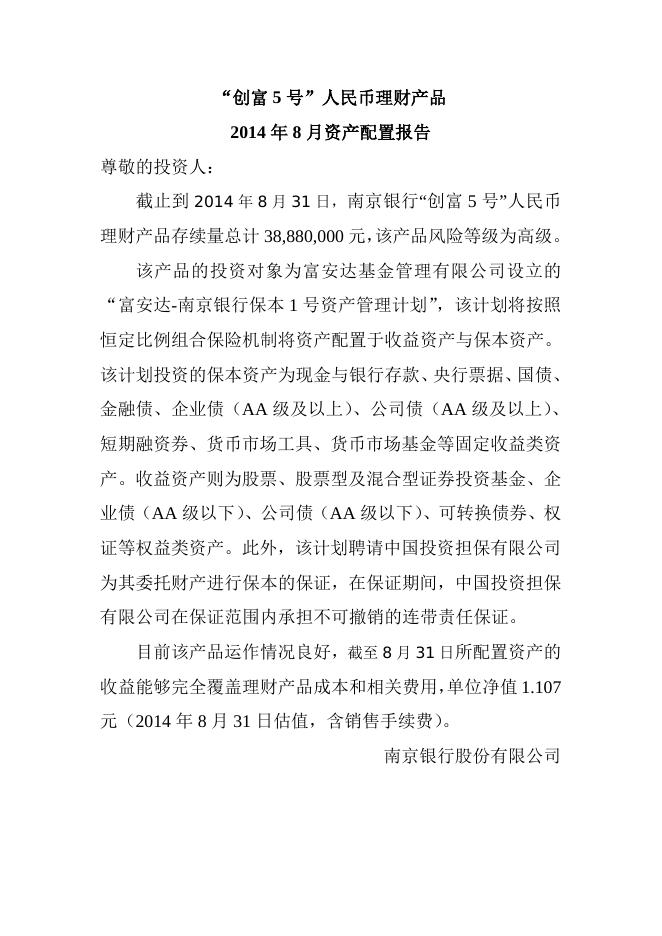 “创富5号”人民币理财产品2014年8月资产配置报告.doc