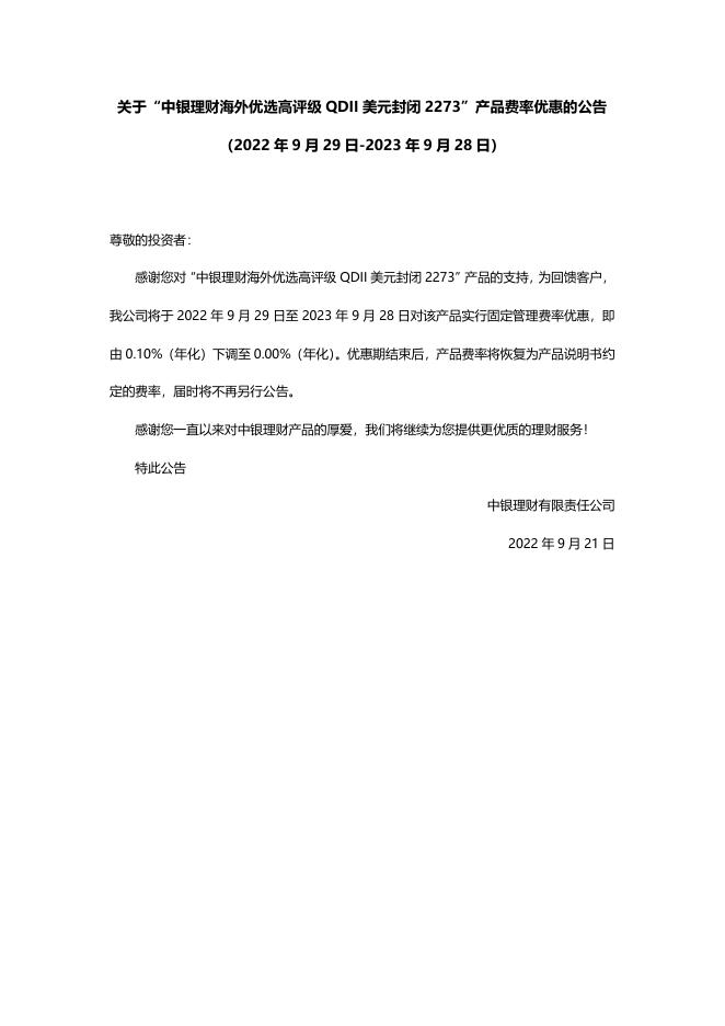 关于“中银理财海外优选高评级QDII美元封闭2273”产品费率优惠的公告(2022年9月29日-2023年9月28日).pdf
