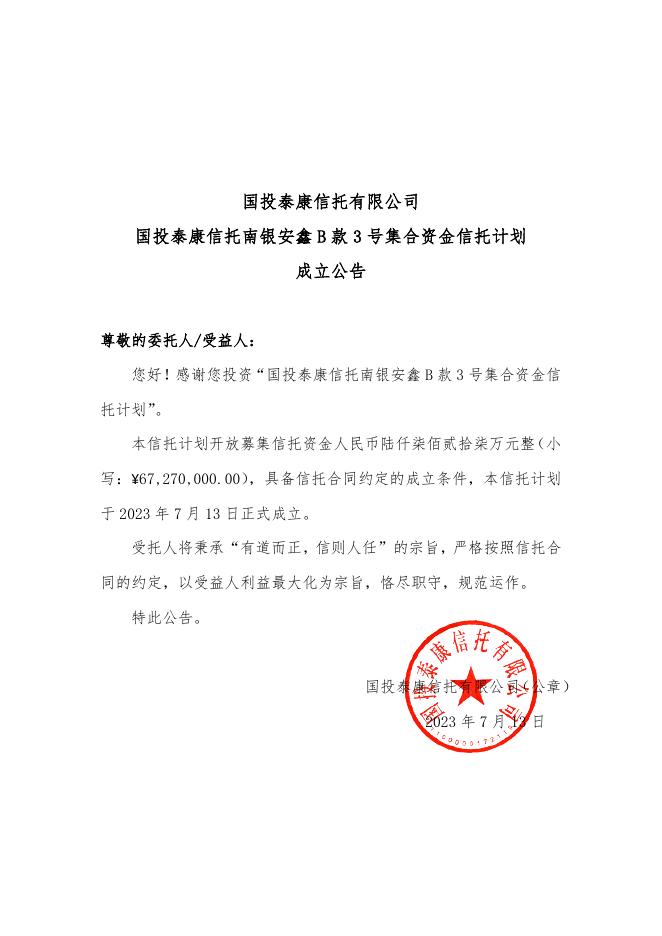 国投泰康信托南银安鑫B款3号集合资金信托计划成立公告.pdf