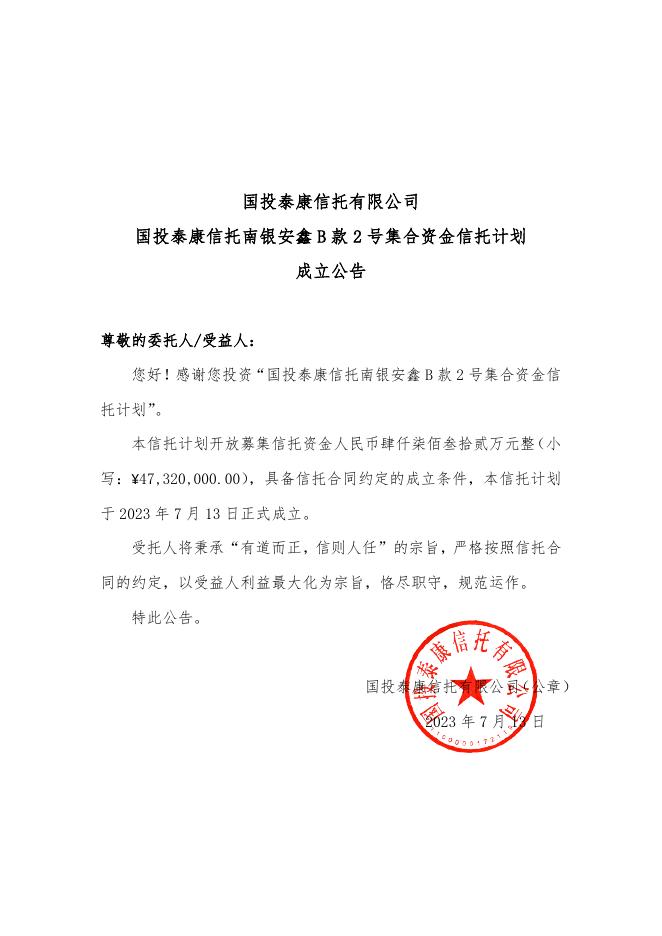 国投泰康信托南银安鑫B款2号集合资金信托计划成立公告.pdf