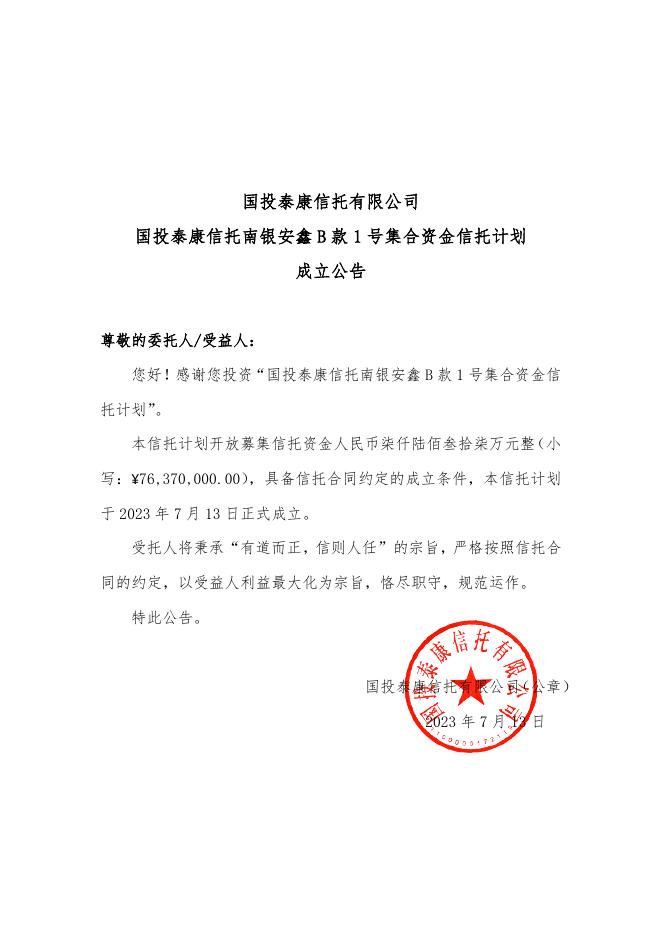 国投泰康信托南银安鑫B款1号集合资金信托计划成立公告.pdf
