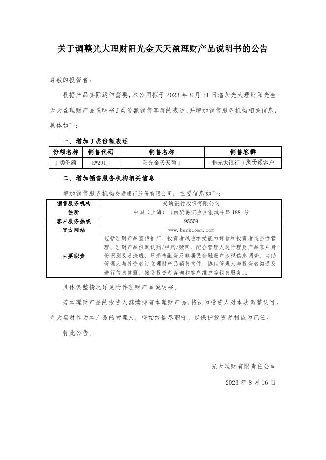 关于调整光大理财阳光金天天盈理财产品理财产品说明书的公告.pdf