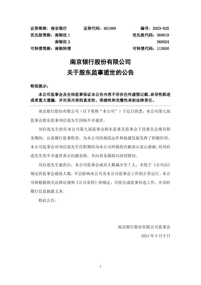南京银行股份有限公司关于股东监事逝世的公告.pdf