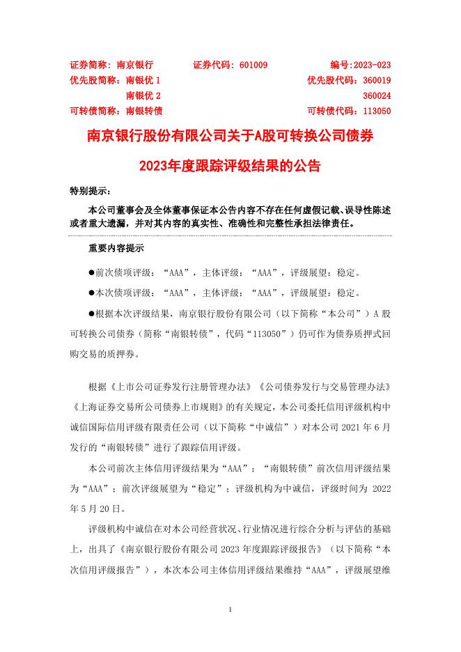 南京银行股份有限公司关于A股可转换公司债券2023年度跟踪评级结果的公告.pdf