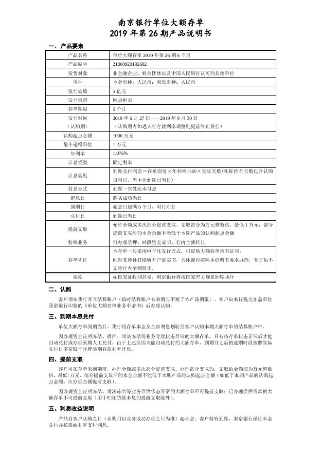 单位大额存单产品说明书(2019年第26期6个月).docx