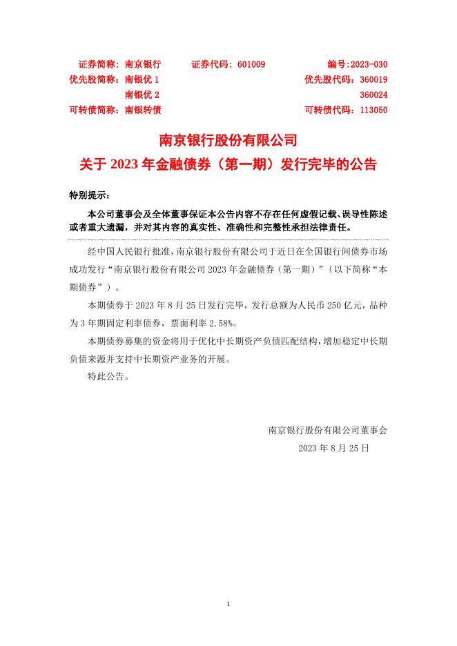 南京银行股份有限公司关于2023年金融债券(第一期)发行完毕的公告.pdf