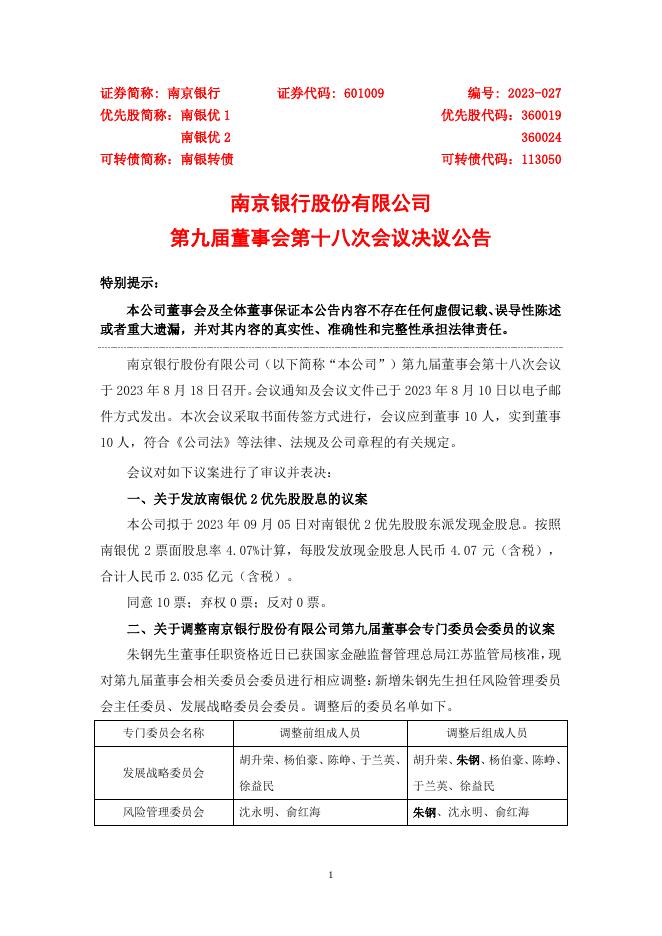 南京银行股份有限公司第九届董事会第十八次会议决议公告.pdf