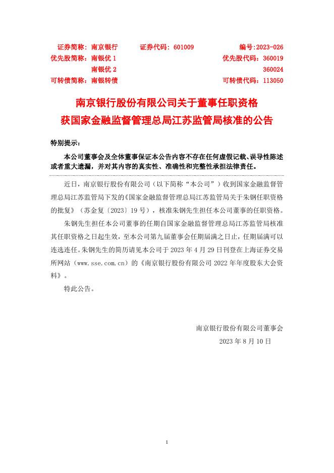 南京银行股份有限公司关于董事任职资格获国家金融监督管理总局江苏监管局核准的公告.pdf
