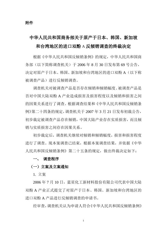 中华人民共和国商务部关于原产于日本、韩国、新加坡和台湾地区的进口双酚A反倾销调查的终裁决定.doc