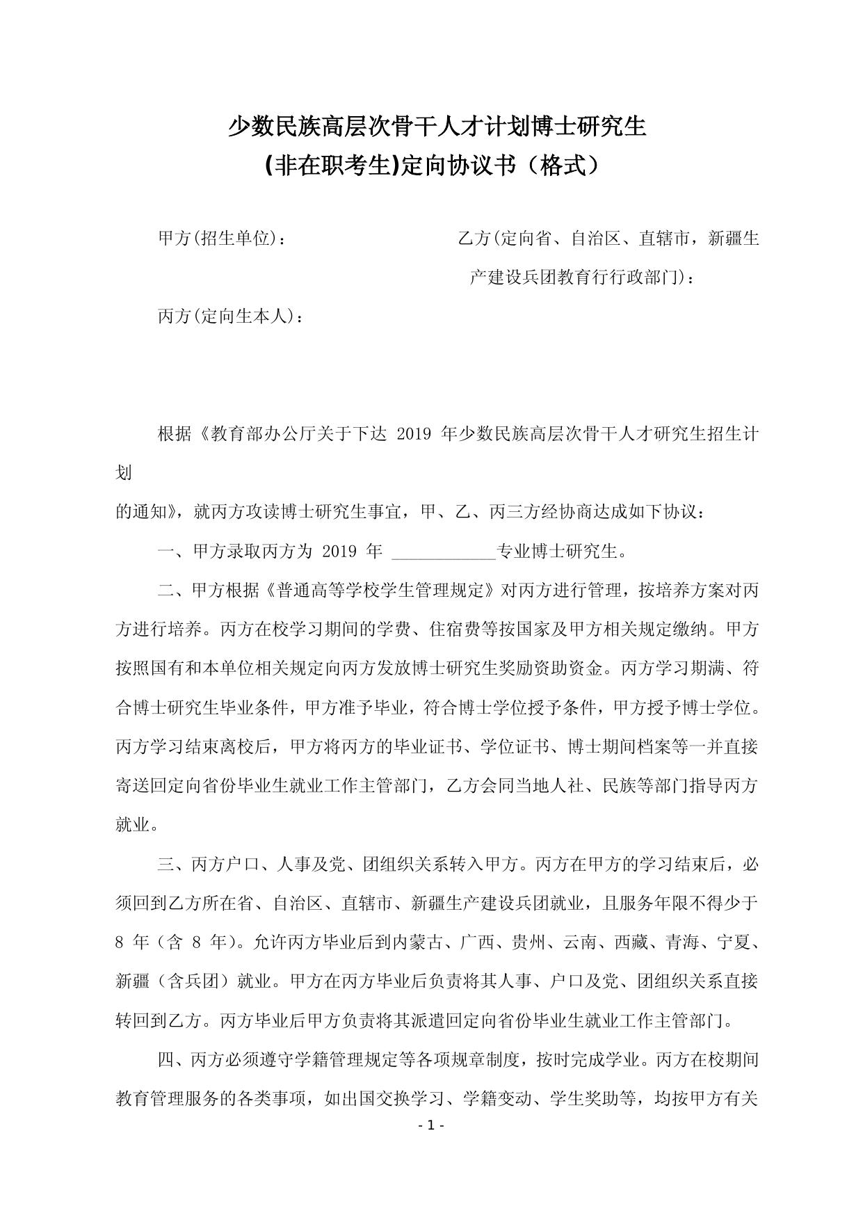少数民族高层次骨干人才计划博士研究生(非在职考生)定向协议书.doc