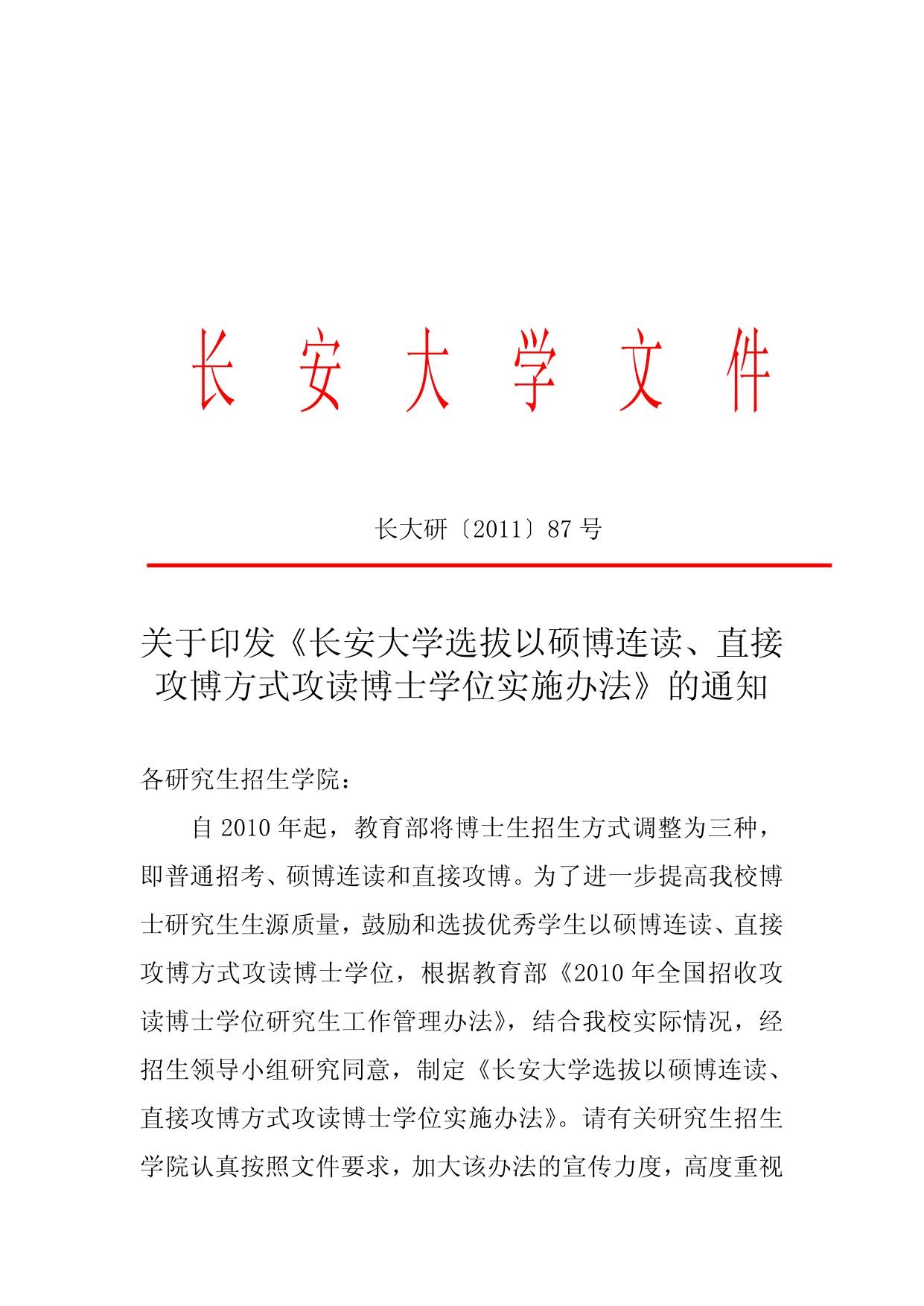 长安大学选拔以硕博连读、直接攻博方式攻读博士学位实施办法(长大研〔2011〕87号).doc