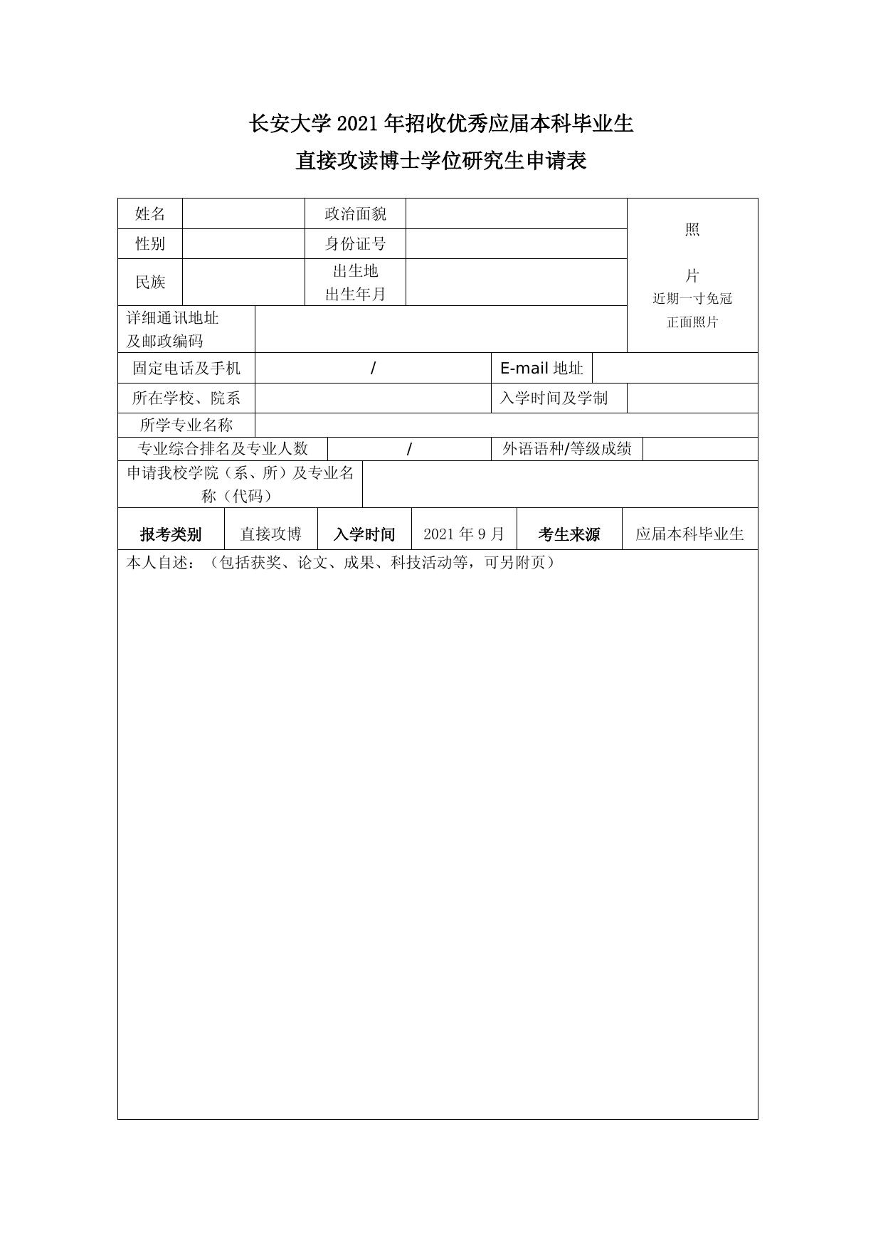 长安大学2021年招收优秀应届本科毕业生直接攻读博士学位研究生申请表.doc