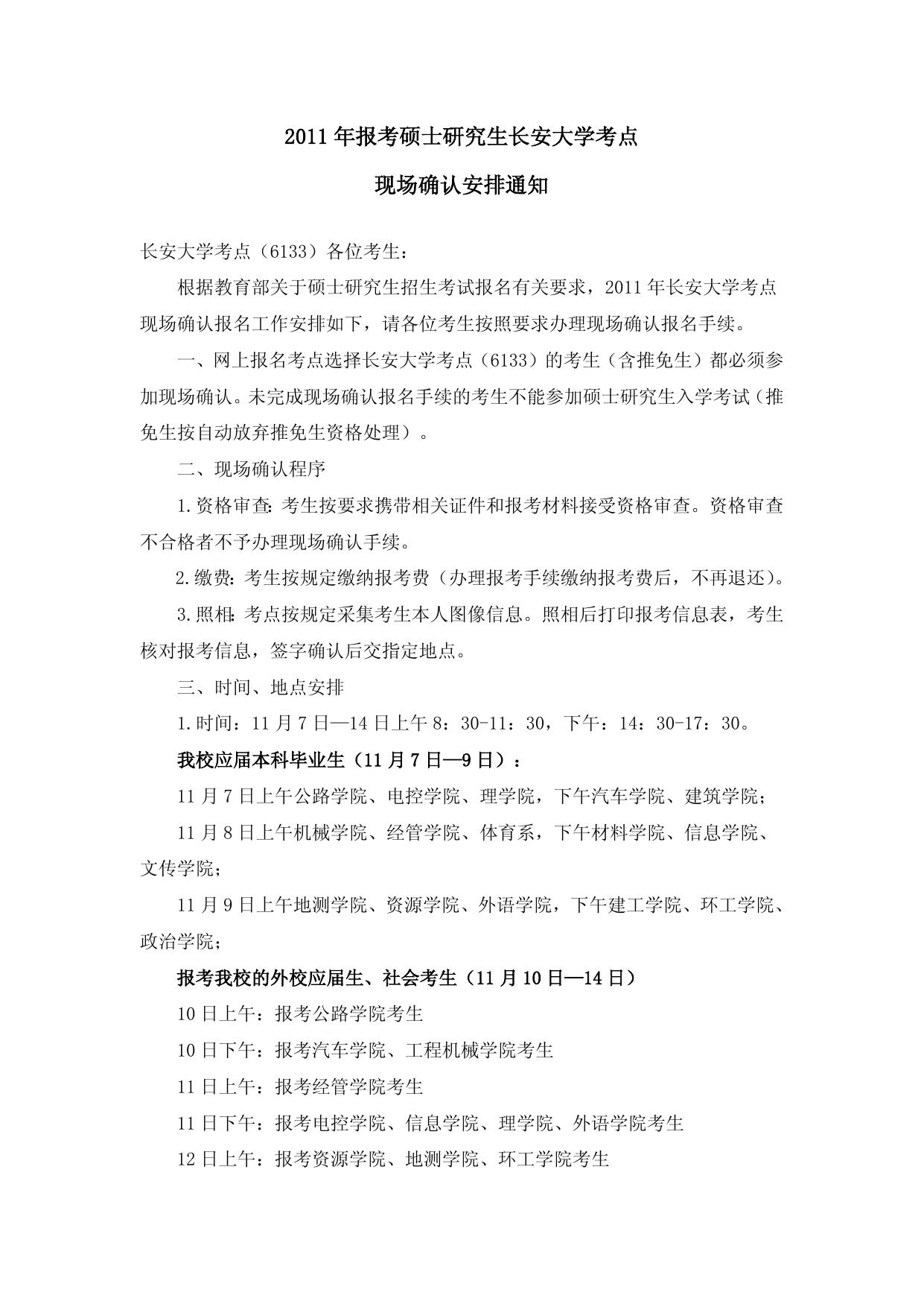2011年报考硕士研究生长安大学考点现场确认安排通知.doc