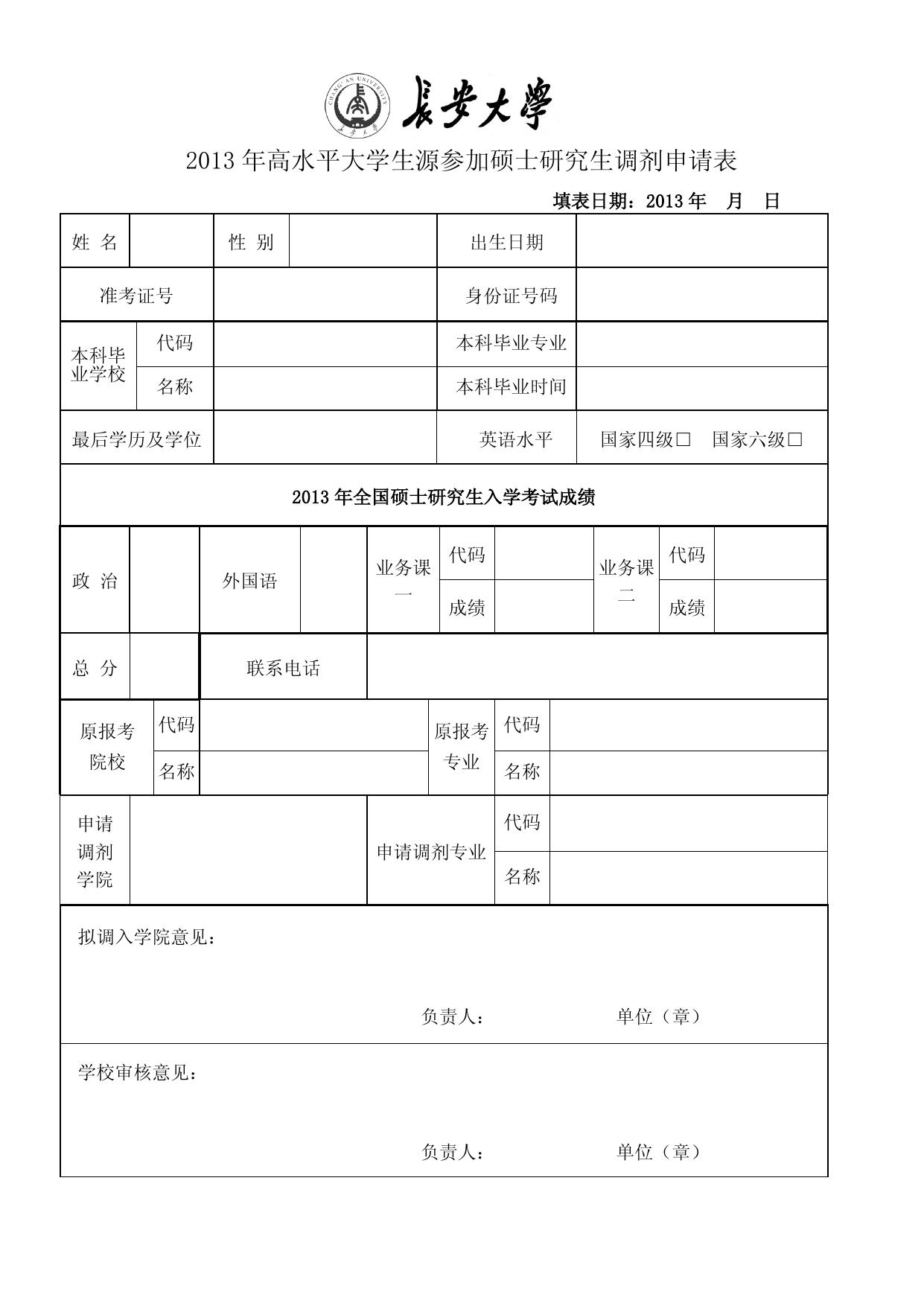 长安大学2013年高水平大学生源参加硕士研究生调剂申请表.doc