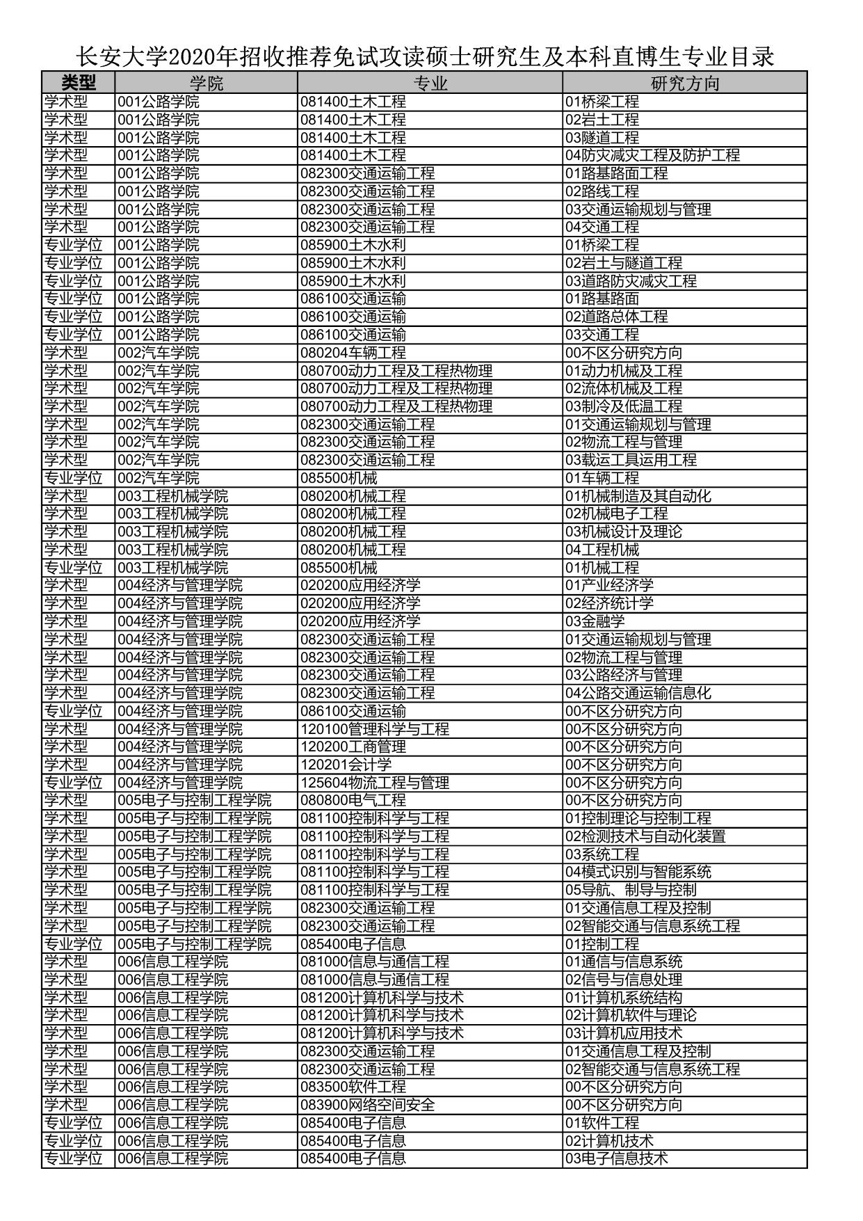 长安大学2020年招收推荐免试攻读硕士研究生及本科直博生专业目录.pdf