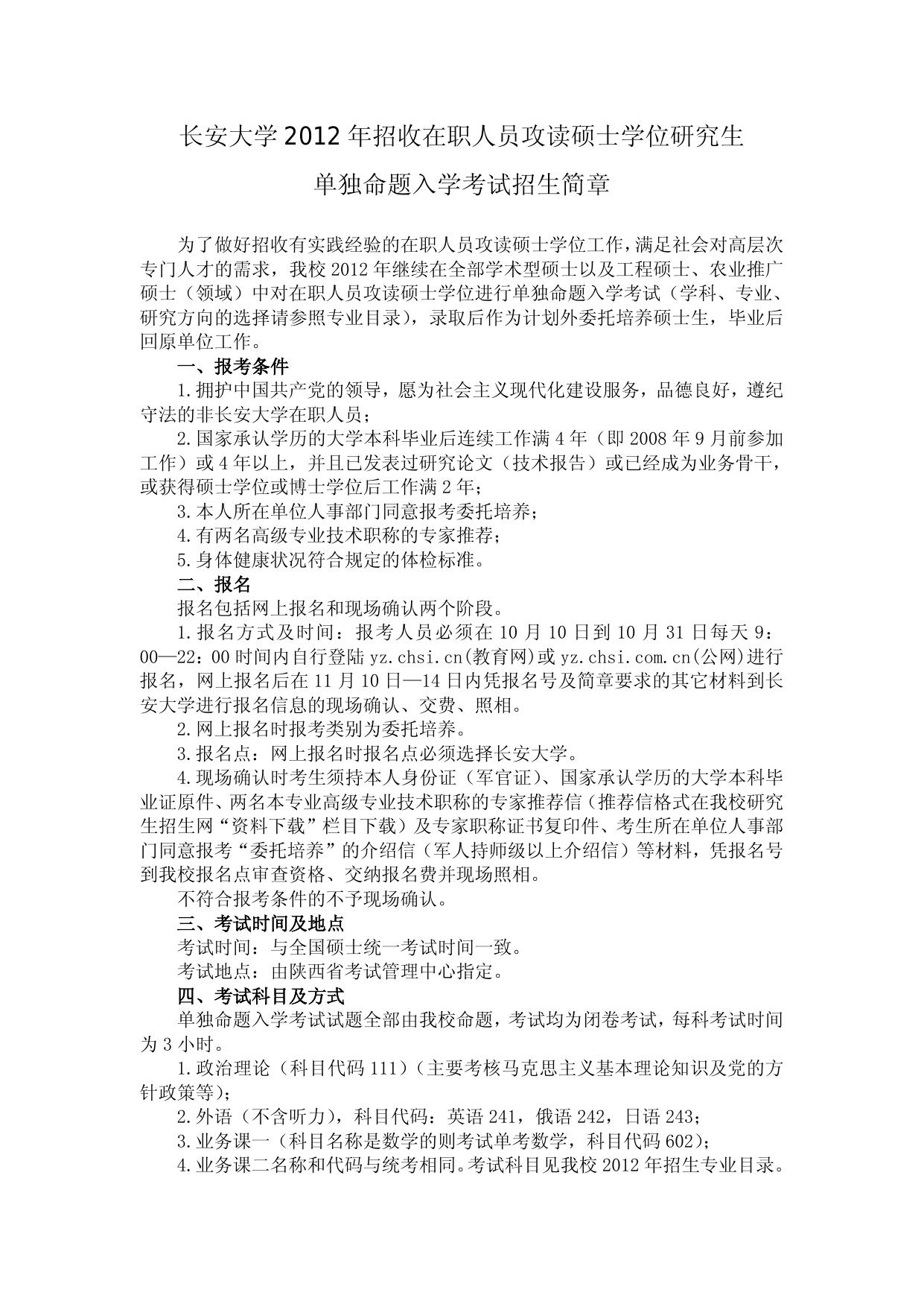 长安大学2012年攻读硕士学位单独命题入学考试招生简章.doc