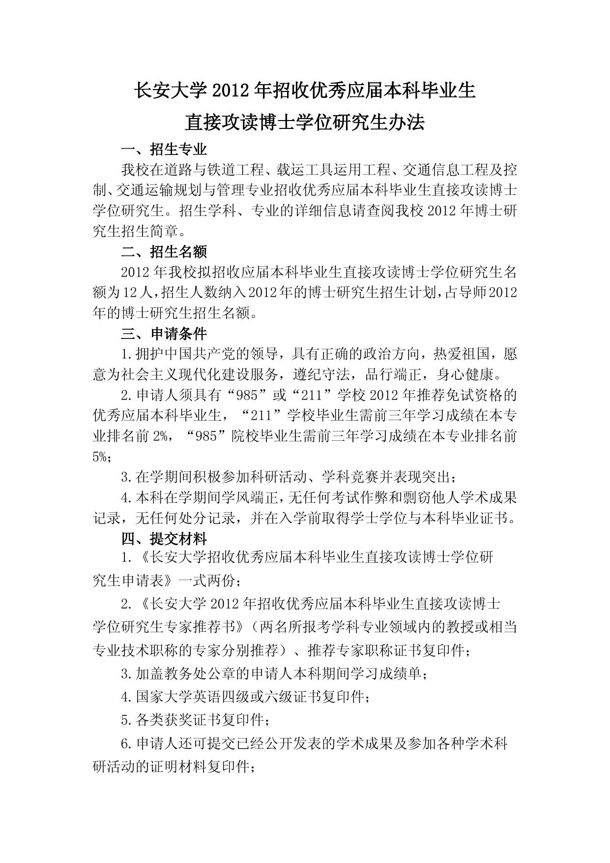 长安大学2012年招收优秀应届本科毕业生直接攻读博士学位研究生办法.doc