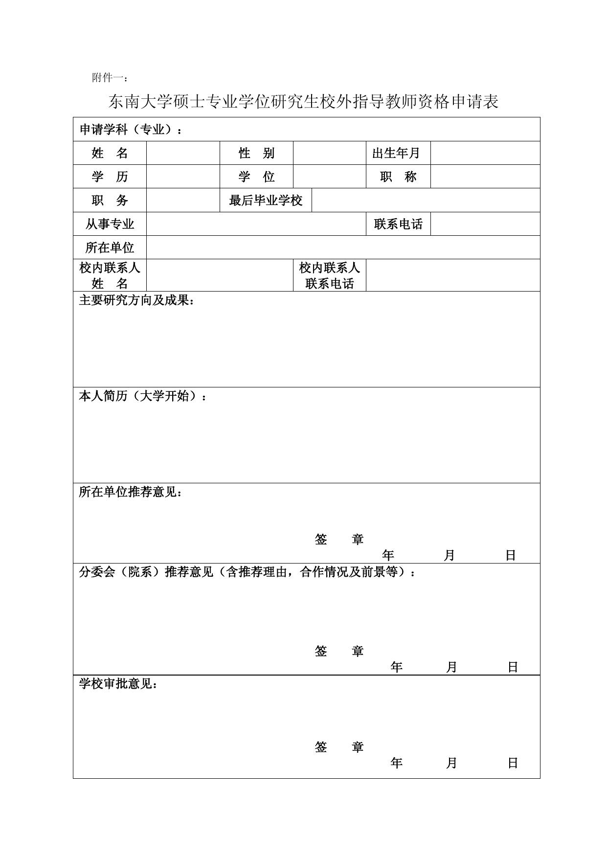东南大学硕士专业学位研究生校外指导教师资格申请表