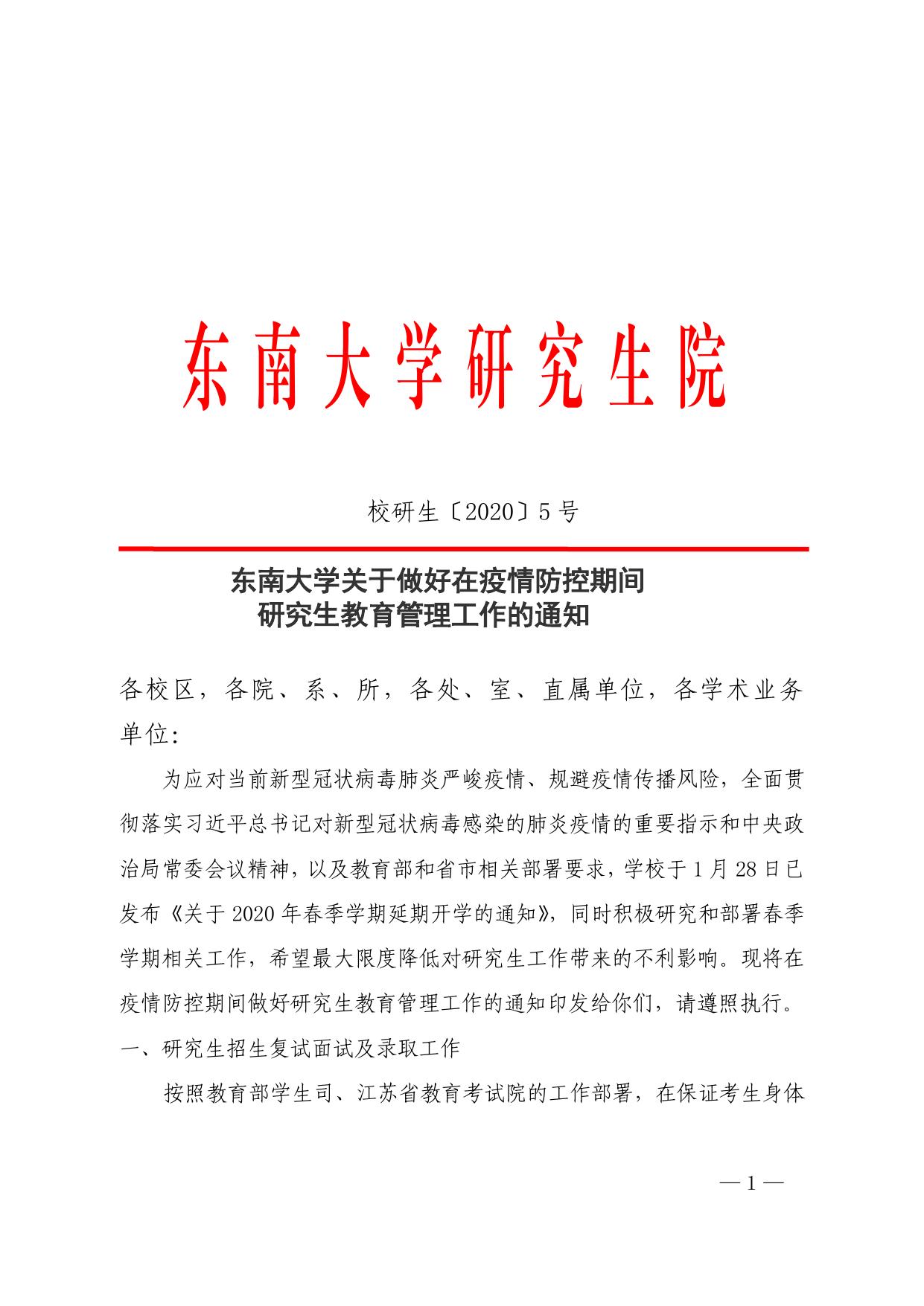 东南大学关于做好在疫情防控期间研究生教育管理工作的通知
