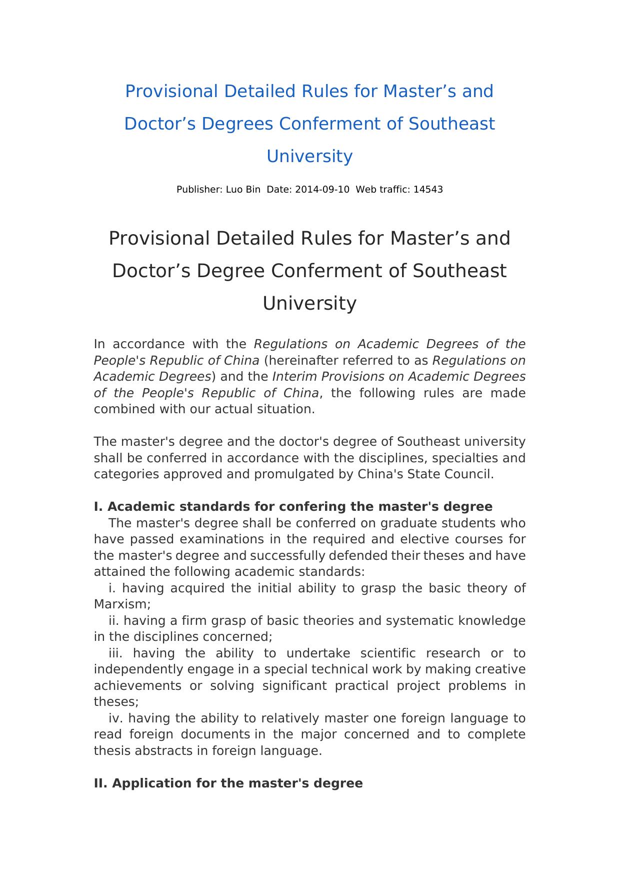 Provisional Detailed Rules for Master’s and Doctor’s Degrees Conferment of Southeast University