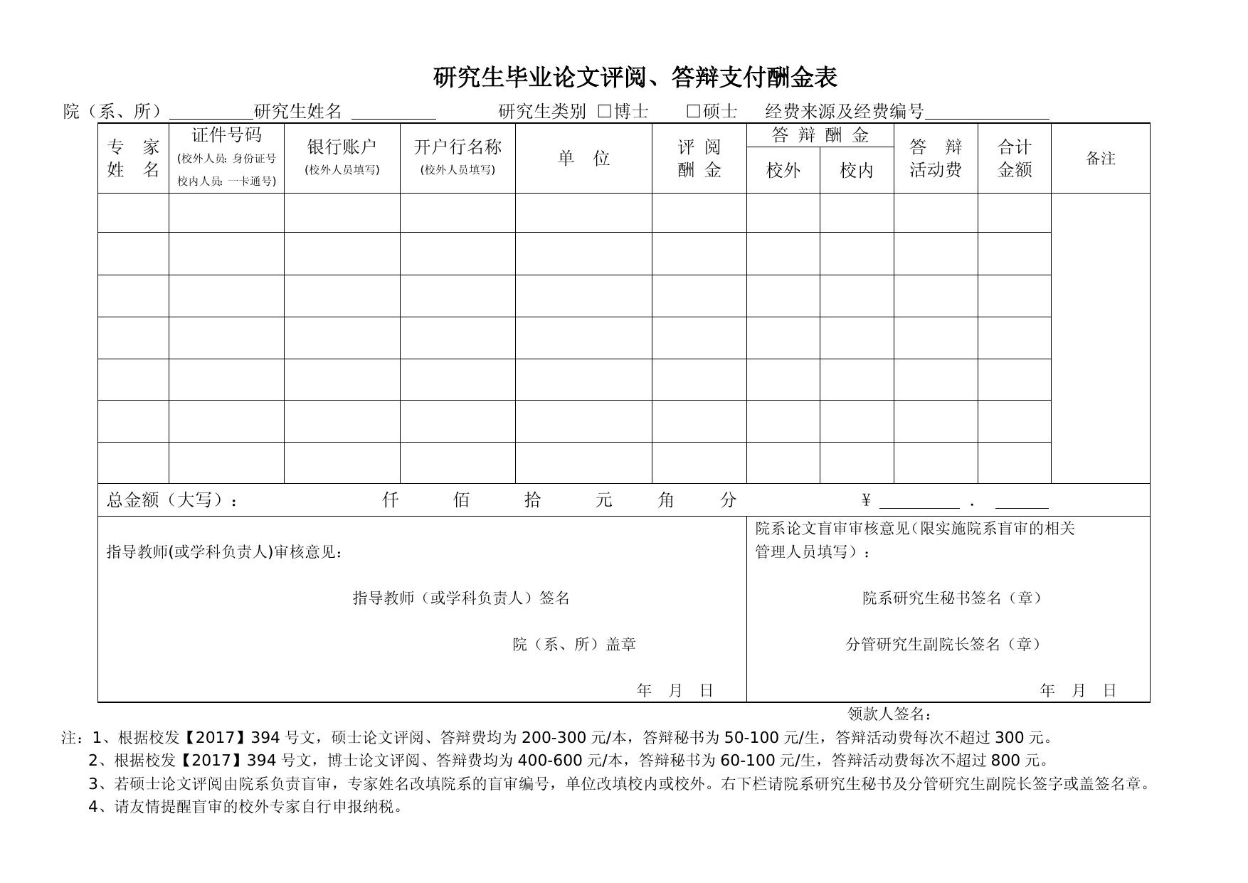 研究生毕业论文评阅答辩支付酬金表(2019-06-04)