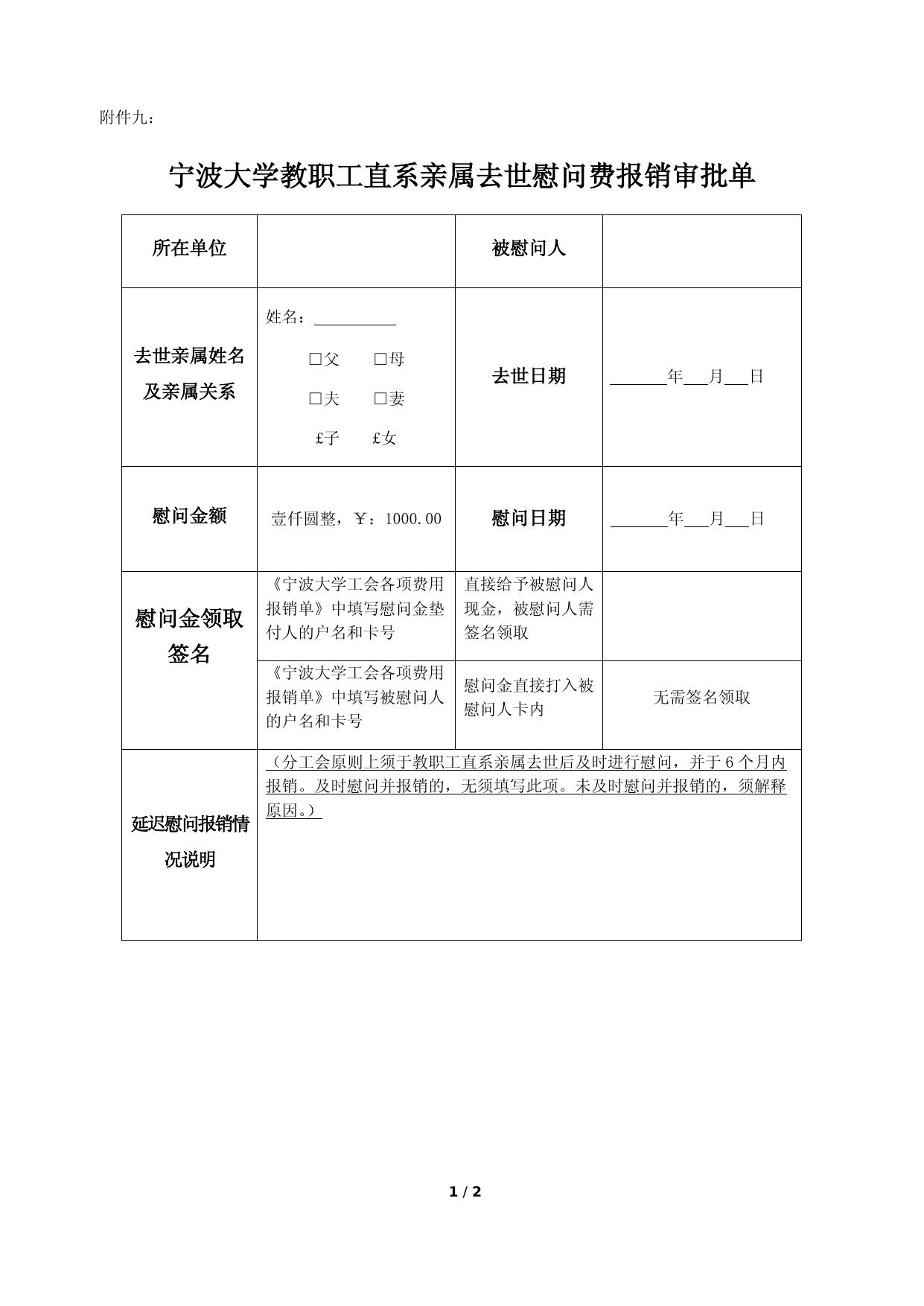 附件9:《 宁波大学教职工直系亲属去世慰问费报销审批单》.docx