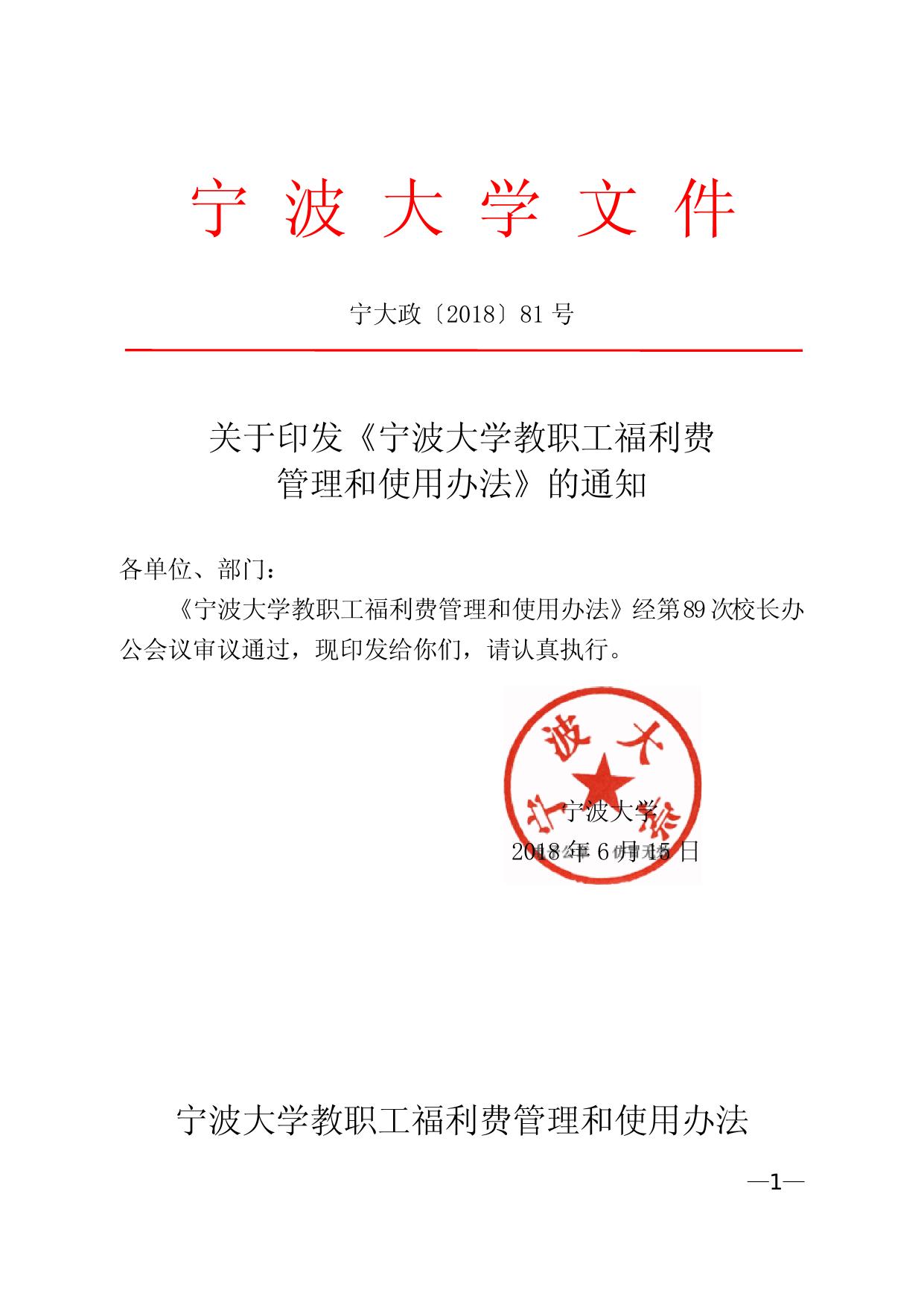 关于印发《宁波大学教职工福利费管理和使用办法》的通知(宁大政〔2018〕81号).doc