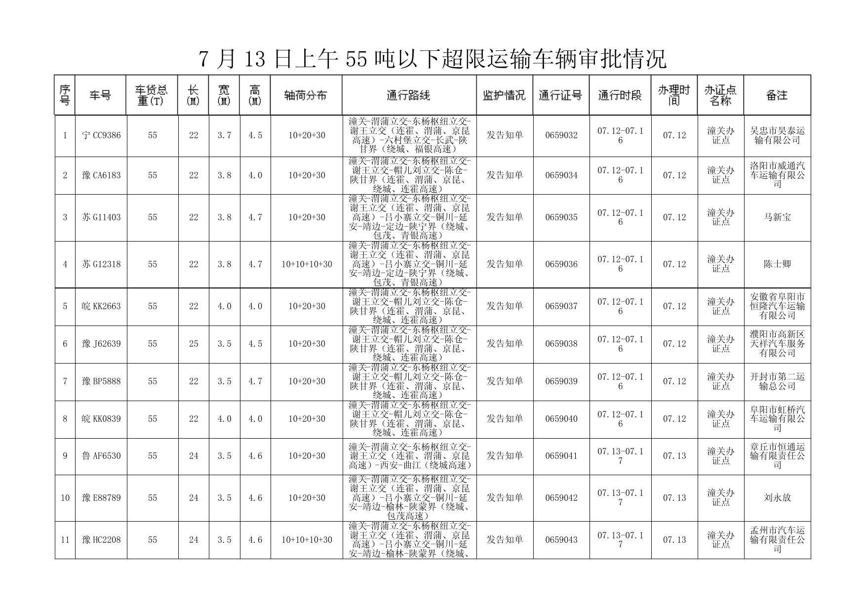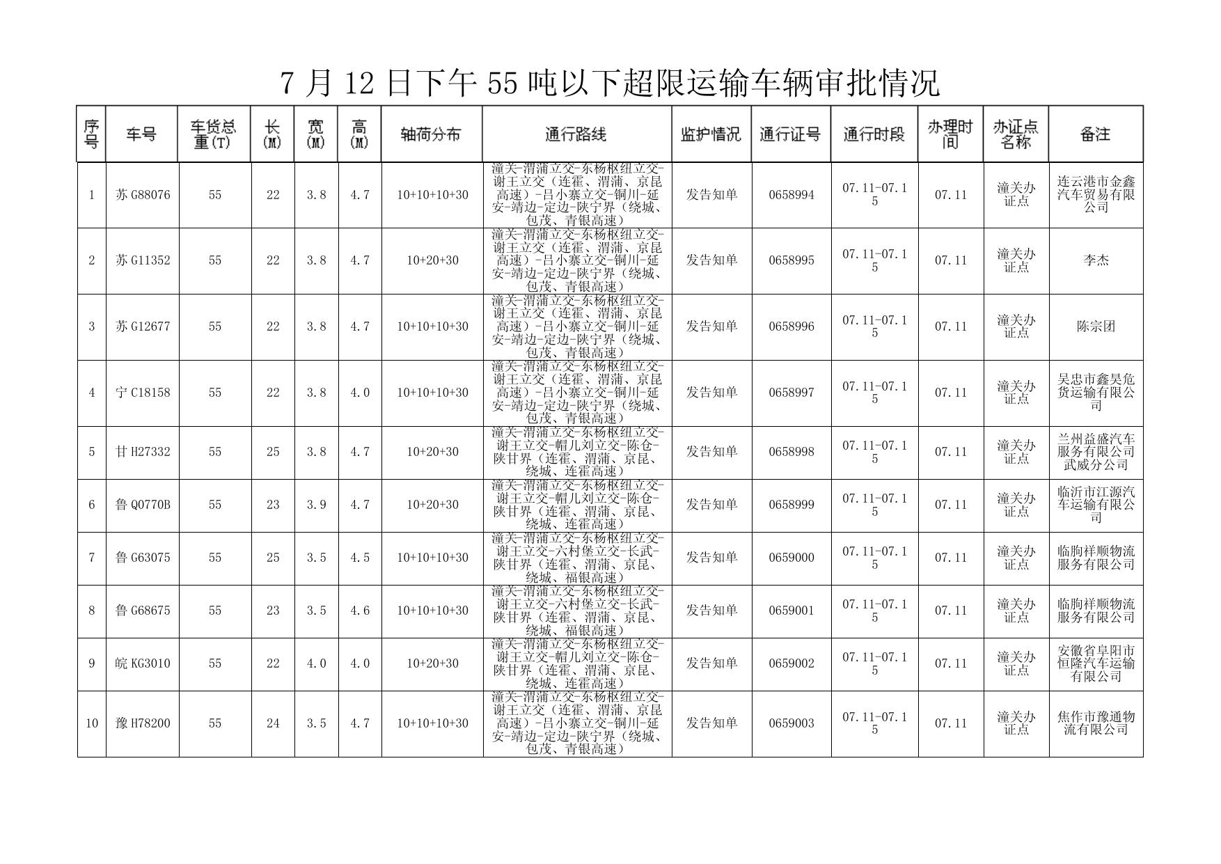7 月 12 日下午 55 吨以下超限运输车辆审批情况
