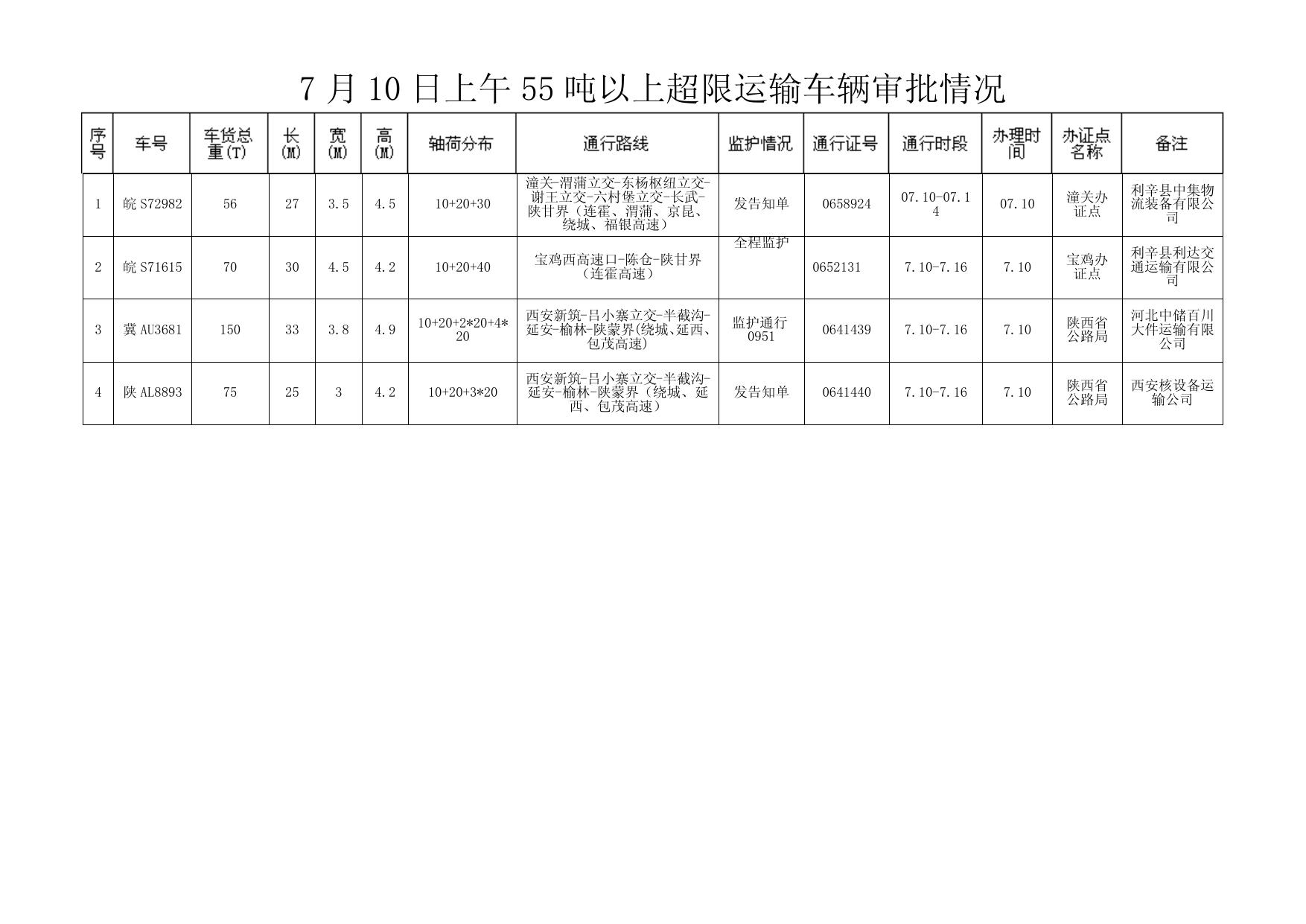 7 月 10 日上午 55 吨以上超限运输车辆审批情况