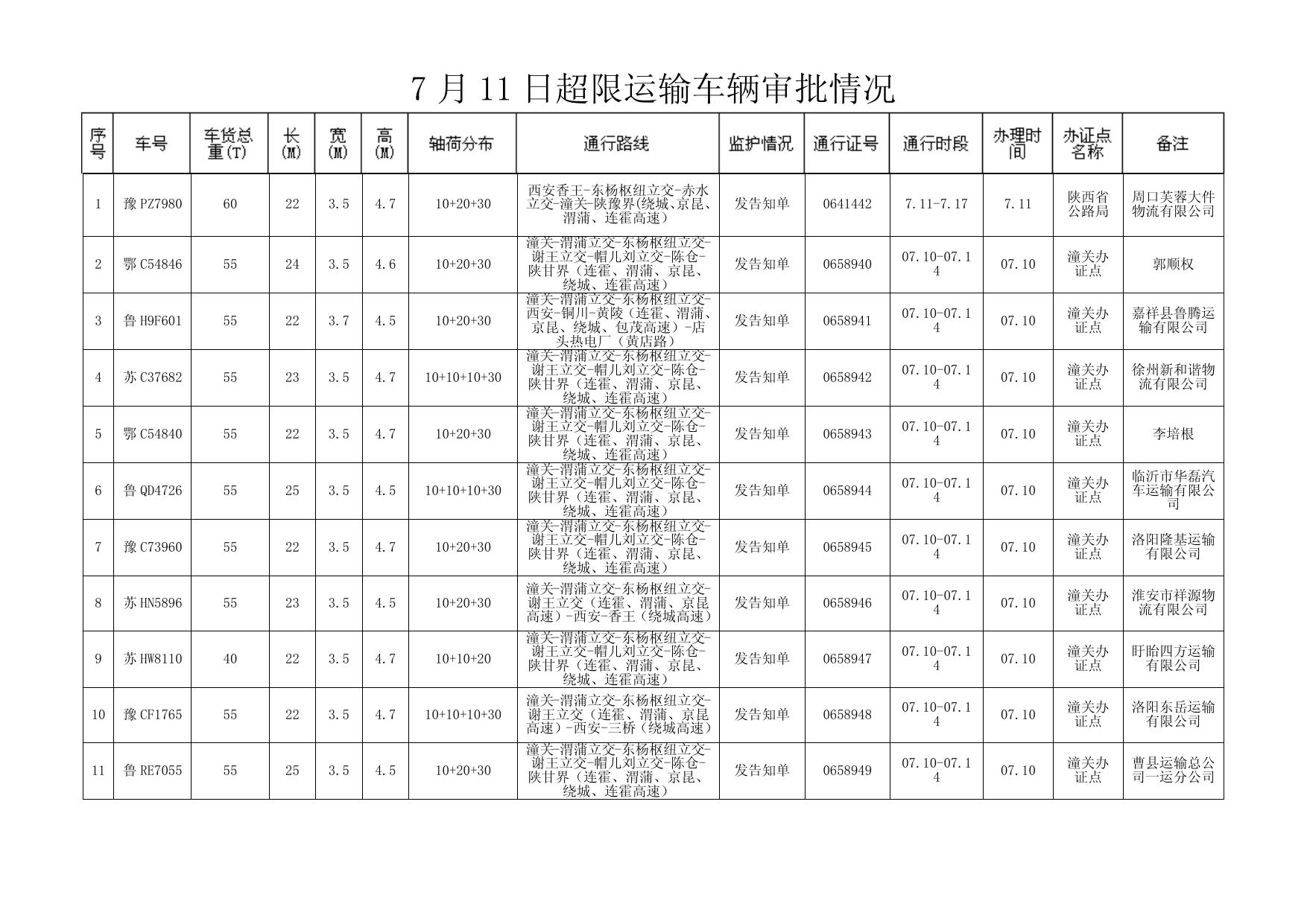 7 月 11 日超限运输车辆审批情况
