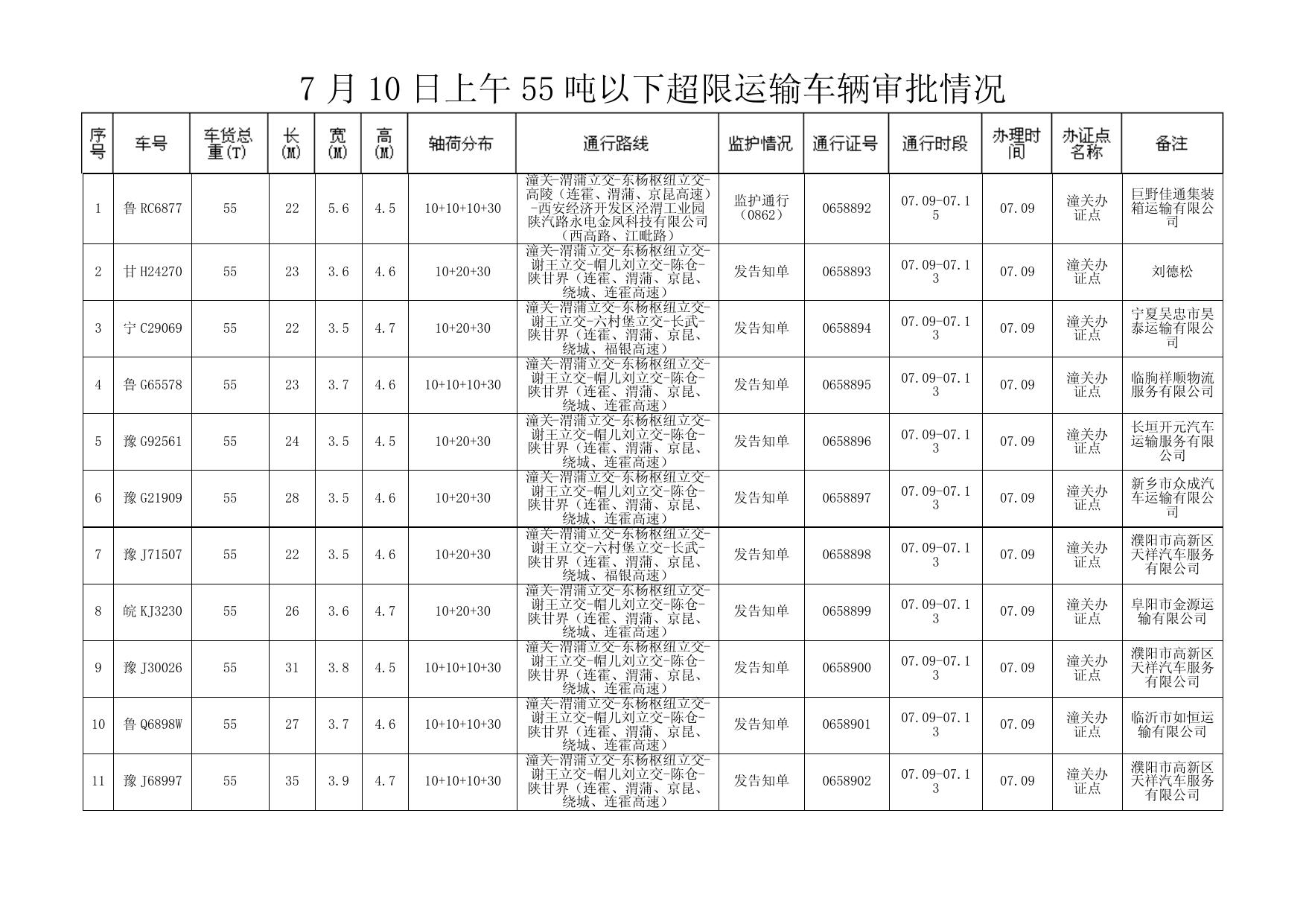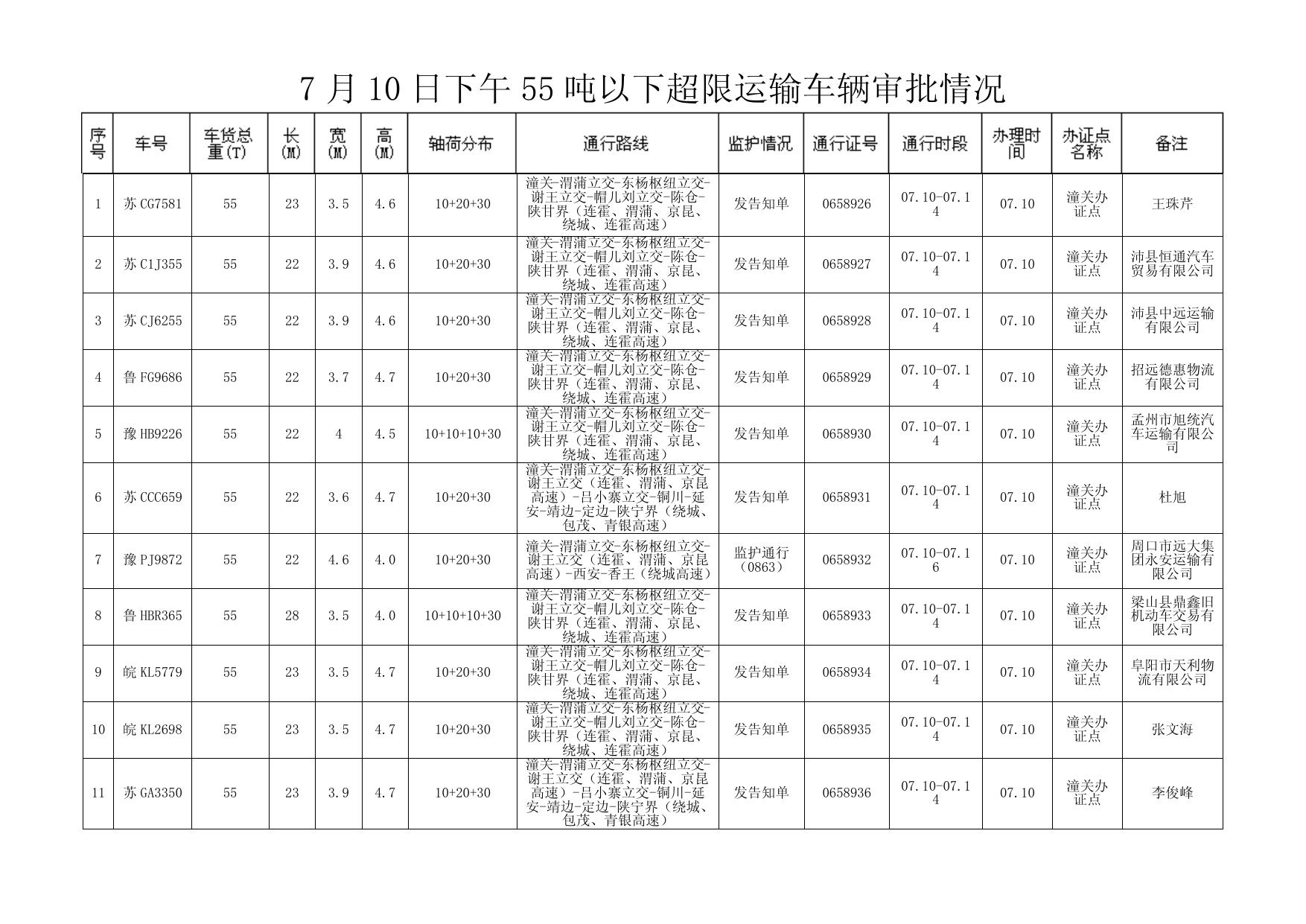 7 月 10 日下午 55 吨以下超限运输车辆审批情况