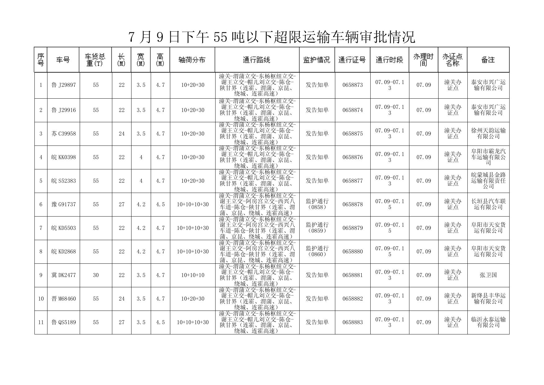 7 月 9 日下午 55 吨以下超限运输车辆审批情况